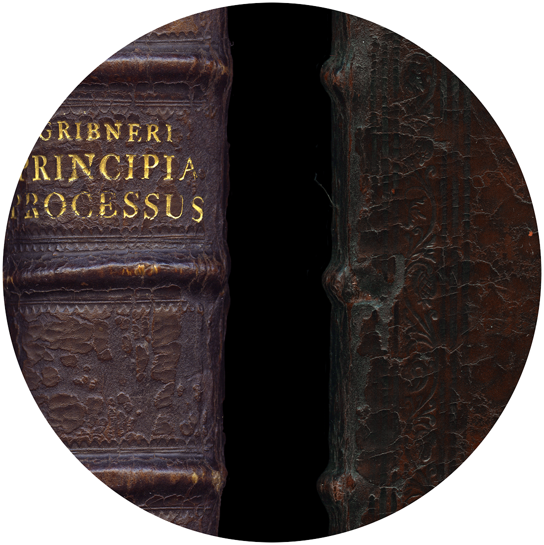 Legatura coeva in pelle marrone (mm 225 x 179 x 40); dorso a cinque nervature; capitelli greggi. Decorazione a secco su piatti e dorso (al secondo compartimento autore e titolo impressi in oro); labbro decorato in oro. Sguardie in carta marmorizzata lavorata a pettine in giallo bianco azzurro rosso verde; tagli dipinti in rosso con motivo a curve.