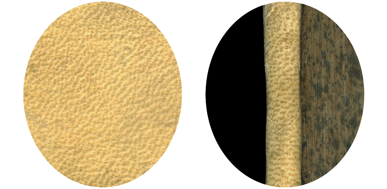 Legatura di fine XVIII secolo in pergamena rigida (mm 251 x 195 x 40), comprendente entrambi i volumi; dorso liscio su tre nervi; capitelli verdi e nocciola su pelle allumata passante. Dorso decorato in oro nella sezione superiore con riquadro delimitato da tripli filetti merlati sui lati esterni, suddiviso in due parti che recano autore e titolo su fondo rosso, numerazione dei volumi su fondo verde. Ai contropiatti carta rosa dorata e goffrata con motivi floreali. Tagli spruzzati in nero; segnalibro in seta verde