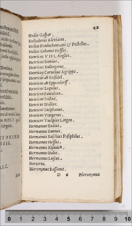 Index librorum prohinitorum, cum regulis confectis per patres à Tridentina synodo delectos, auctoritate sanctiss. D. N. Pii IIII, pont. max comprobatus (c. 19r--59r) |